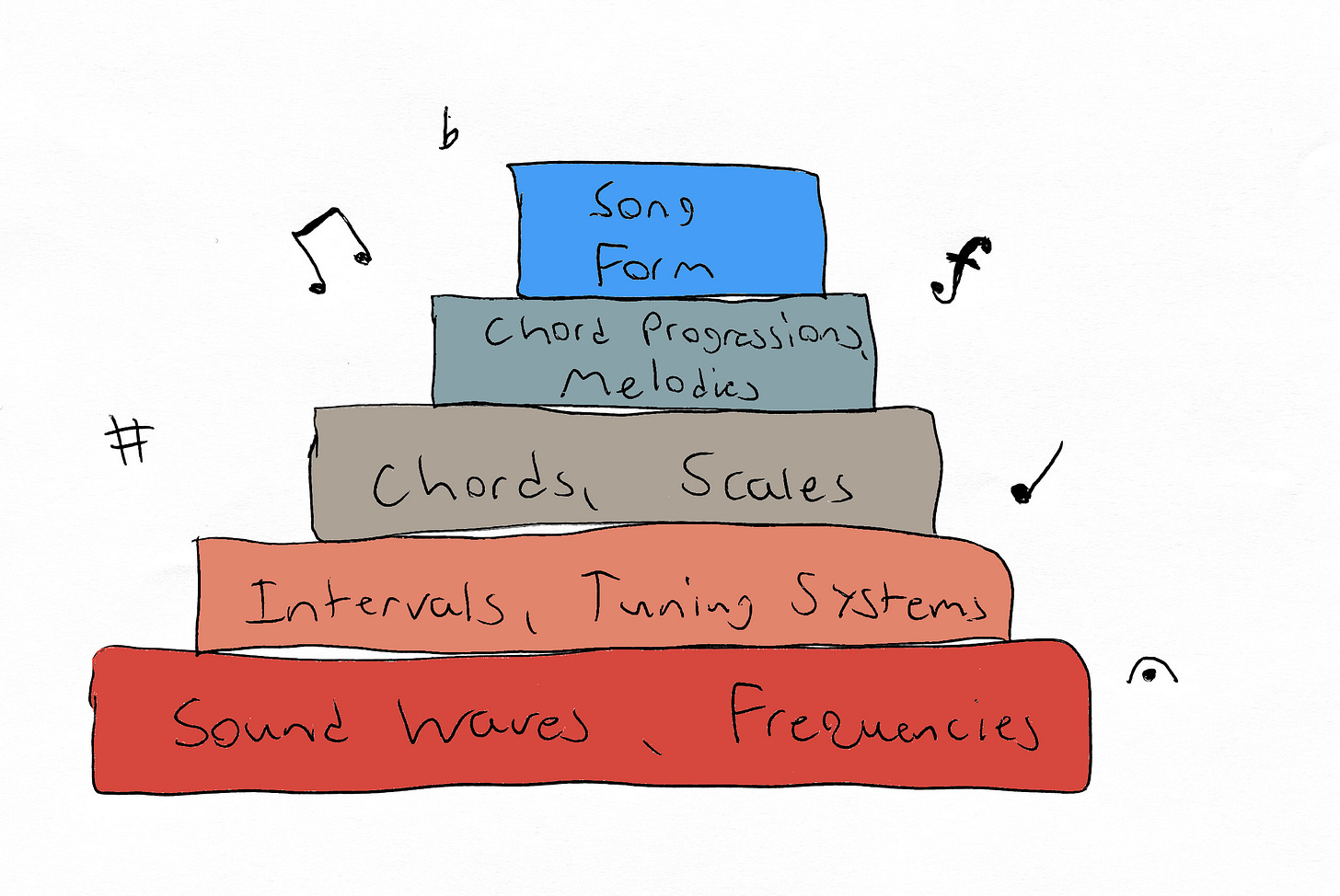 There are many interesting concepts in the bottom levels, each with their own motivating questions and history. How do sound waves of a certain frequency become classified as one of the 12 notes we use today in Western music? Why do we use 12 notes? Why does the same note sound different on different instruments? What’s the circle of fifths and where does it come from? Why do we have sharps and flats? Why is sheet music drawn the way it is? (I could continue this list all day, there are several interesting things happening here that all tangentially relate to each other).